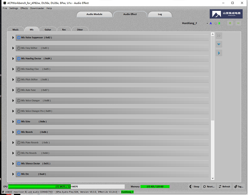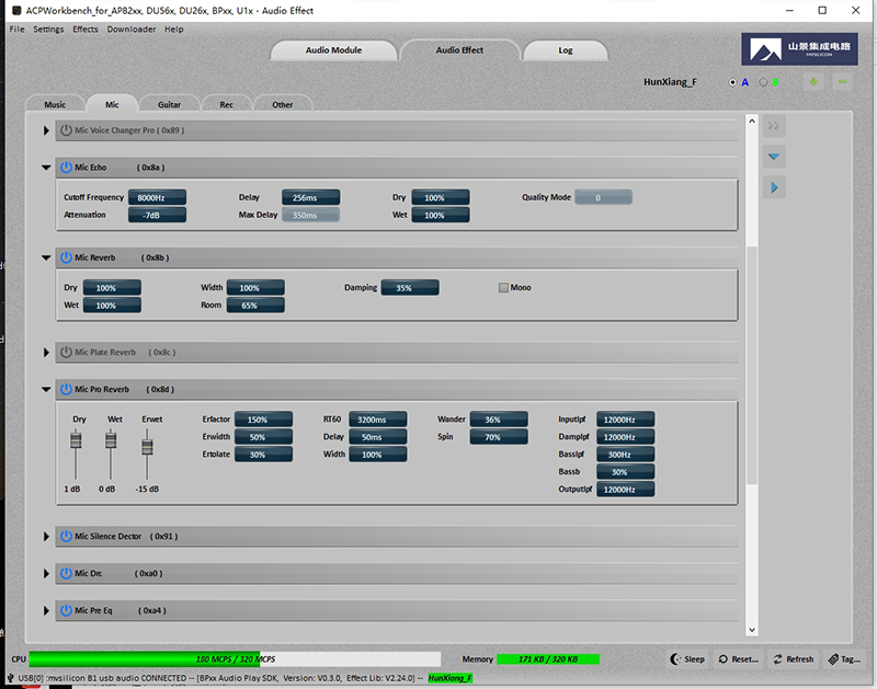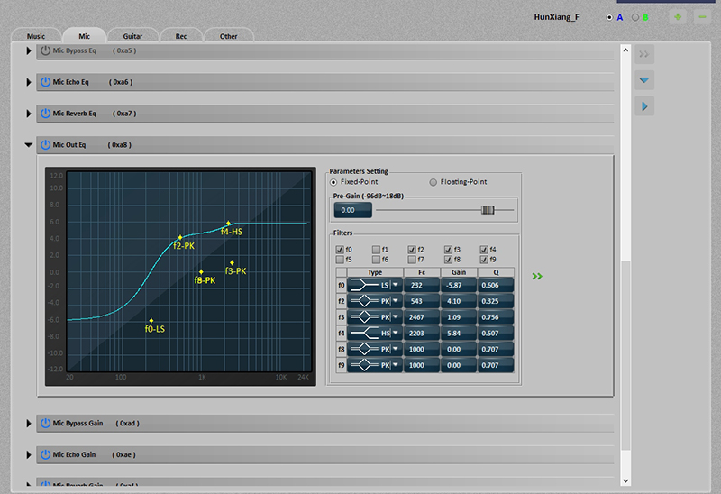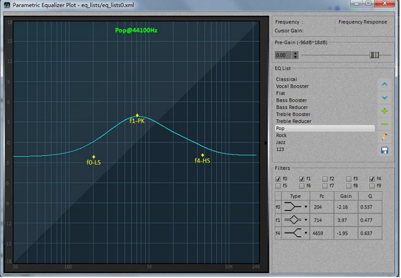 各种EQ参数、重低音、3D立体声加宽器、谐波激励器、带通滤波器、低通高通滤波器、陷波器等;